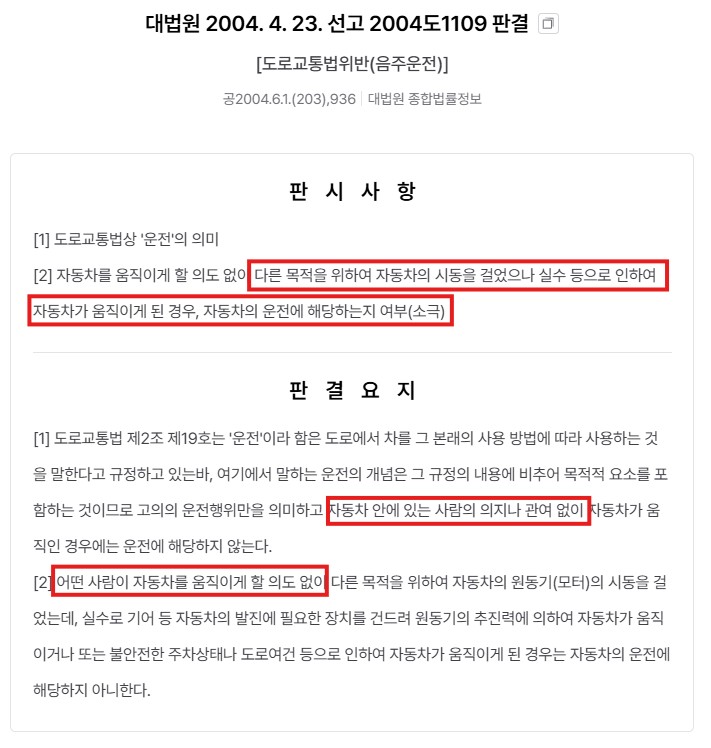 즉, 음주 상태에서 차가 움직였다고 해서 곧바로 음주운전이 되는 것이 아니라 운행하려는 의사가 있었는지가 핵심 기준이라는 겁니다.