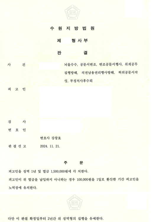 변론이 받아들여진 결과, 법원은 ‘성과에 대한 압박 및 민원이 있던 상황에서 본인의 업무를 적극적으로 수행하면서 발생한 것으로 그 경위에 참작할 점이 있다’라고 인정하여 집행유예의 판결을 선고하였고, 집행유예 기간도 비교적 짧게 받을 수 있었습니다.