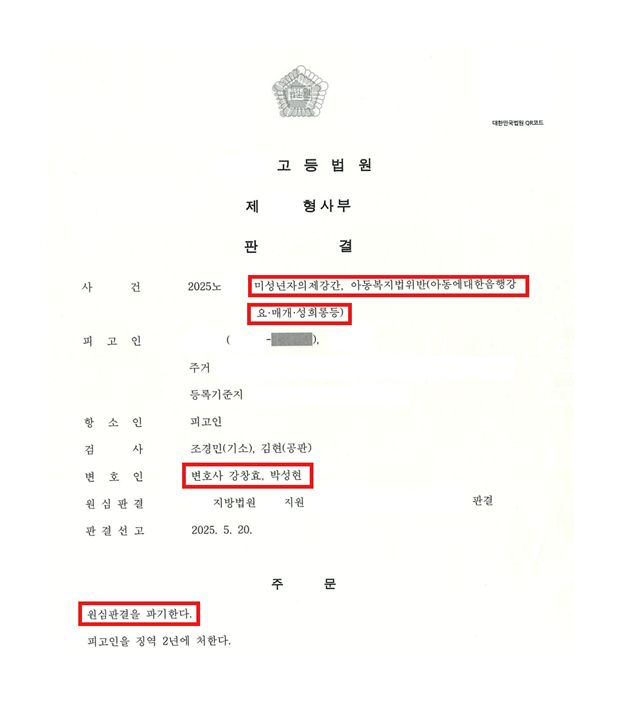 이후 보이스톡을 통해 자연스레 친분이 생겼고, 피해자의 나이가 16세 미만이라는 사실을 인지하게 되었음에도 연락을 이어갔고 결국 성관계로 이어졌습니다.