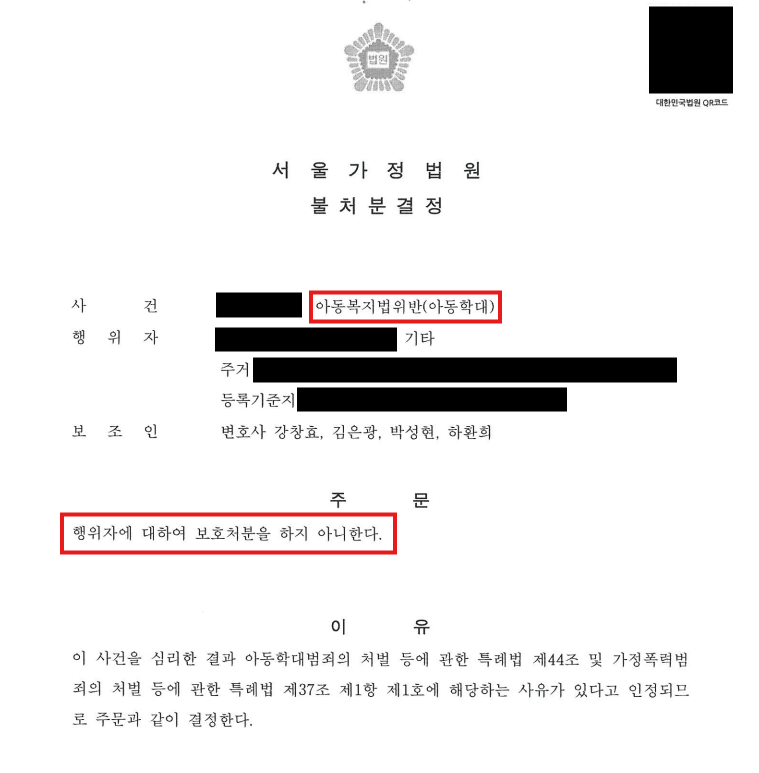 이번에 소개해드릴 성공사례는 의뢰인인 엄마가 아이를 훈육하는 과정에서 아동복지법 위반 혐의로 가정법원에 회부되었으나, 서울가정법원에서 보호처분을 하지 않는 ‘불처분 결정’을 받은 사례입니다.