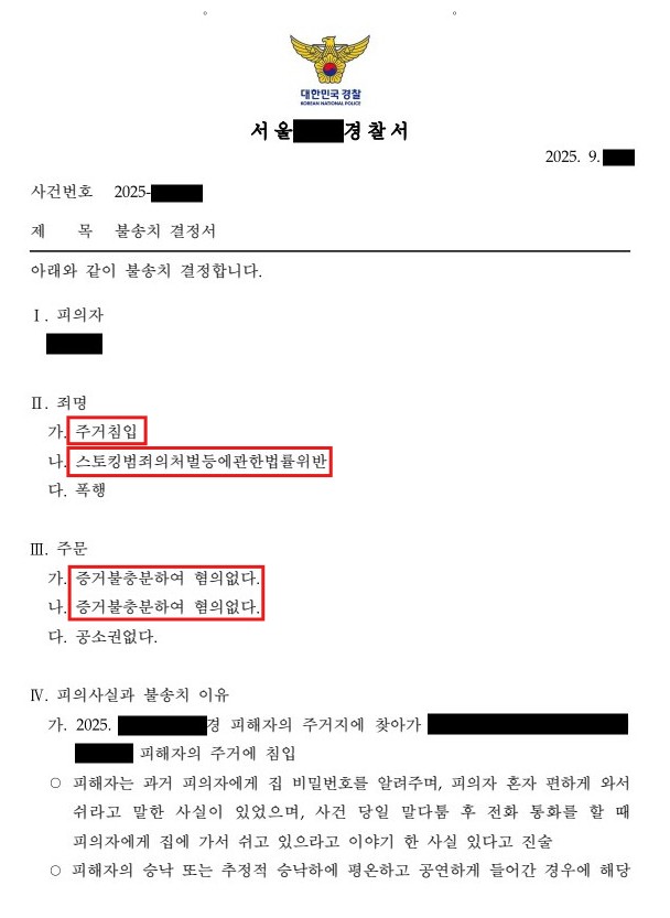 [주거침입,스토킹] 불송치(혐의없음) 결정